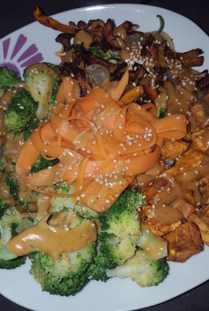Shaved raw carrots (yum!), diced and roasted tofu, steamed broccoli with delicious tahini dressing made this meal healthy and satisfying, but the crimini mushrooms and onions added a heartiness and earthiness that made this dish close to perfect!