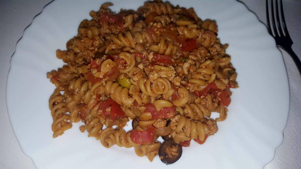 As you can see from the photos there are tomatoes, fresh tomatoes, green and black olives, large capers and ground tofu. But let’s take a moment and talk a little bit about ground tofu because it is a wonder of the world. I’ll tell you later this week about the Shepherd’s Pie I created with it but right now let’s talk about this slightly greasy, but packed full of flavor pasta dish that kept my belly full and warm.