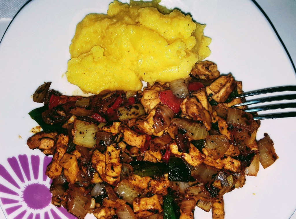 As you can see, I opted for my go to quick & easy vegan option: veggies and protein. Today I just chopped up some smoked tofu and seasoned it right along with the onions, bell peppers and garlic with basil, oregano, cayenne pepper, cumin and a pinch of turmeric. It was spicy and delicious and it took all of 5 minutes while Mama took care of the mămăliga.