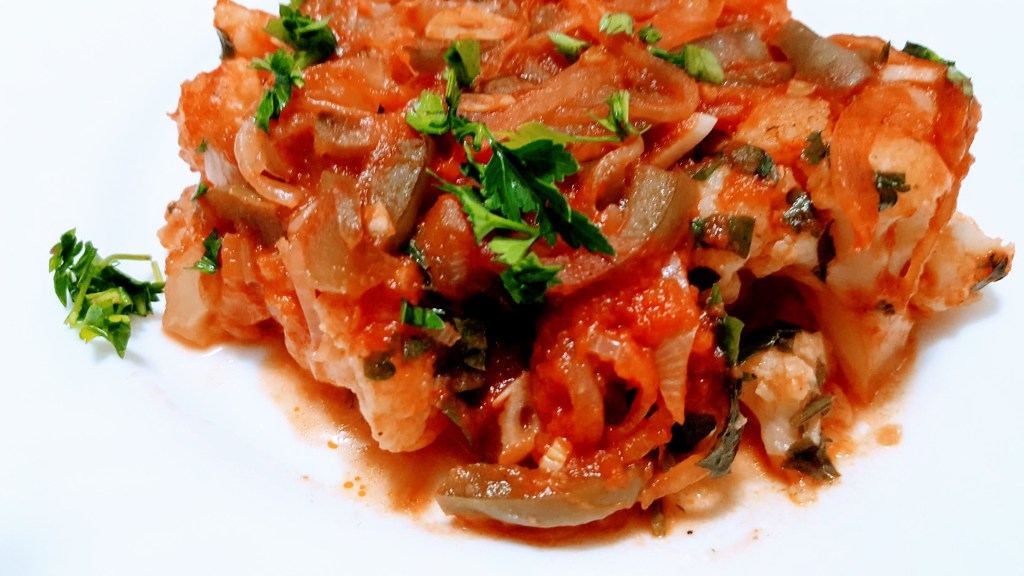 Now it’s time to gather your toppings–onion, garlic, tomatoes, parsley, salt & pepper, herbs & spices–and cook them just a bit until the onions and garlic are transparent. You can use fresh tomatoes or canned but the fresh ones really take this dish to a whole new level. That sweet, fresh goodness also allows you to add a hint of spice or if you’re like me…a whole lotta spice.