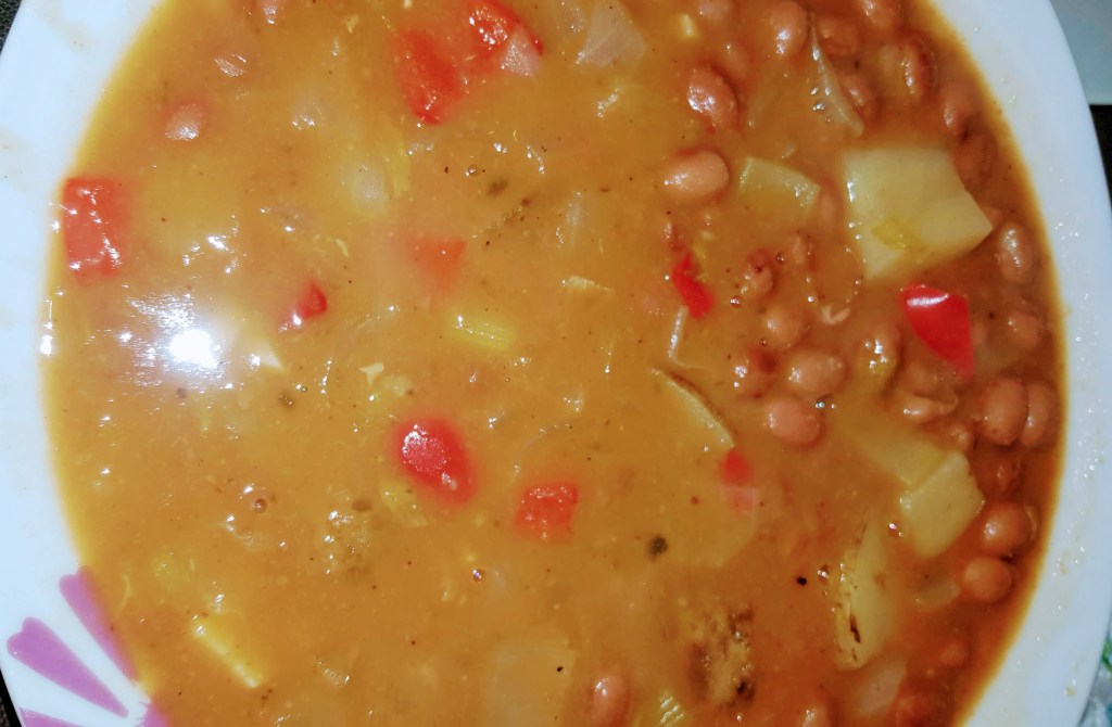 Okay so, I gathered all my ingredients: pinto beans, onion, bell pepper (any color you choose), celery, potatoes and garlic. I always like to saute my vegetables before starting a soup because I think it provides a deeper flavor, particularly when you add a bay leaf or two during the simmer time.