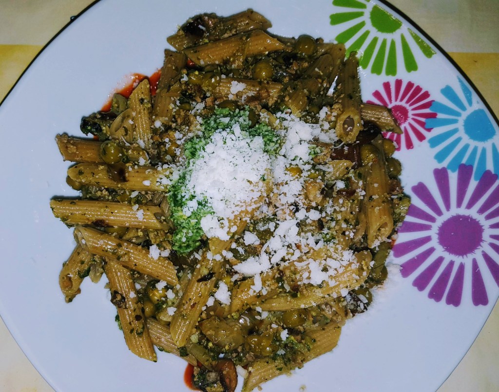 The rest of the dish was super easy. I used a couple teaspoons of extra virgin olive oil to saute the onions and crimini mushrooms for about 5 to 7 minutes. Then I added a 1/4 cup of peas and tofu crumbles, seasoning with salt, pepper, oregano, thyme and a pinch of smoky paprika. When everything was done, I drained the pasta and tossed it with the onion & mushroom mixture before tossing with pesto in batches until every bite was coated.