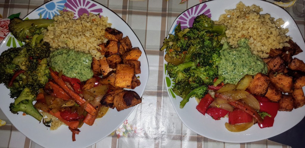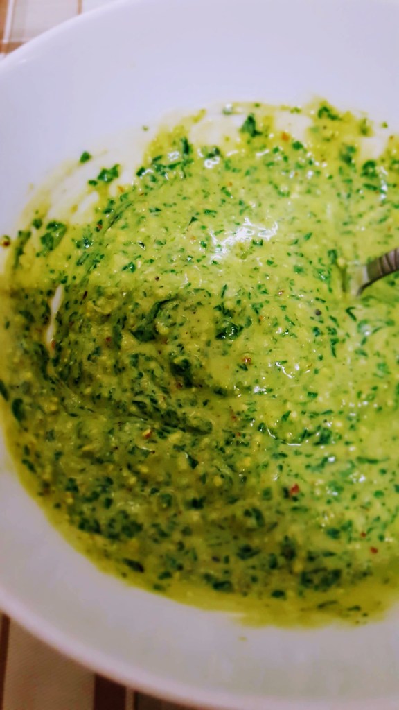 I made a creamy pesto that began as a regular basil pesto complete with garlic, cashews (couldn’t find pine nuts), lemon juice, Tabasco sauce, salt and black pepper. I split the pesto in half and chucked one half in the fridge for later and for the other, I added a quarter cup of vegan yogurt and a tablespoon of mustard for a delicious pesto cream that complimented the dish perfectly.