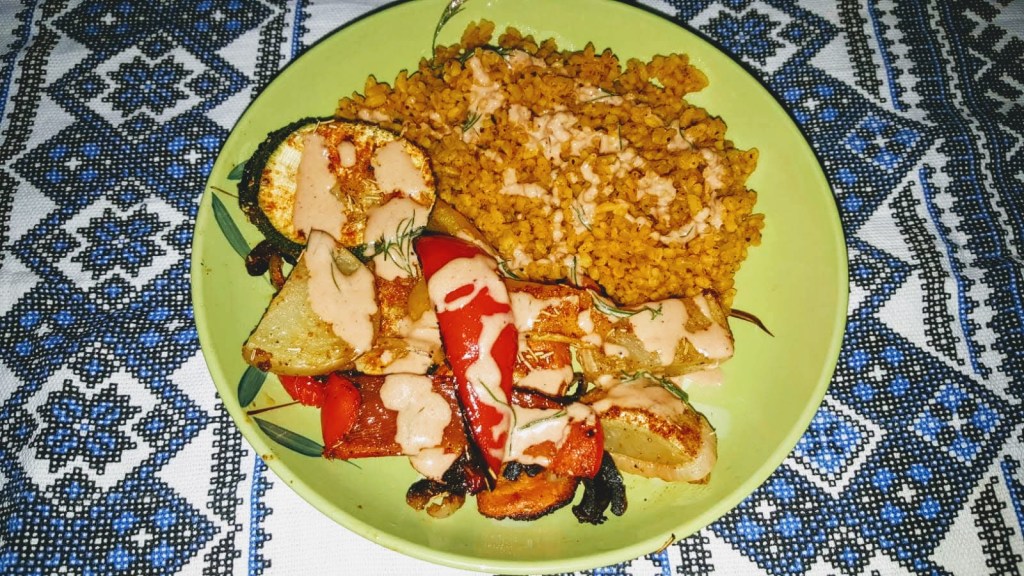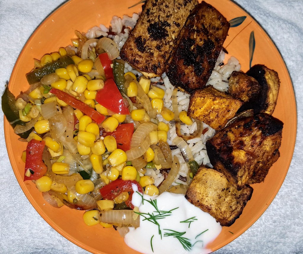 Now it’s time to talk about the “extras”. If you want to add anything else, there’s always tofu. It’s not entirely necessary but I do enjoy cooking and sometimes I want to experiment like here, I used a jerk spice blend on the tofu to get it a little blackened and it worked really well the rice and the corn relish…plus the lemon-dill yogurt sauce!