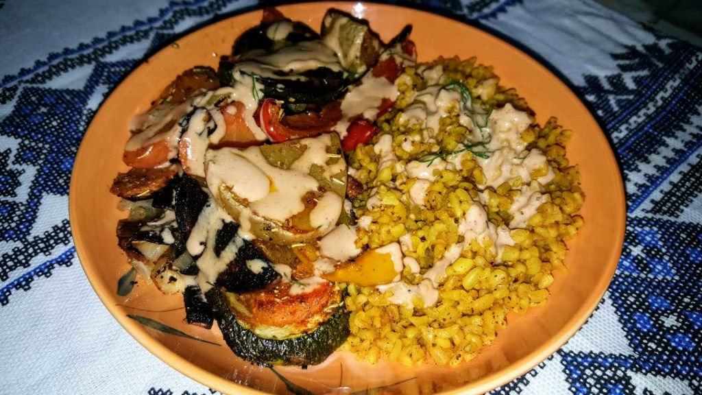 When it comes to a Buddha bowl, I try to use at least 3 different vegetables but really it depends on what I find at the supermarket or the Farmer’s Market. The bowl above has zucchini, carrots, potatoes and bell peppers, all tossed with a drizzle of olive oil, herbs & seasoning and it was tossed in the oven to cook for 20 to 30 minutes.