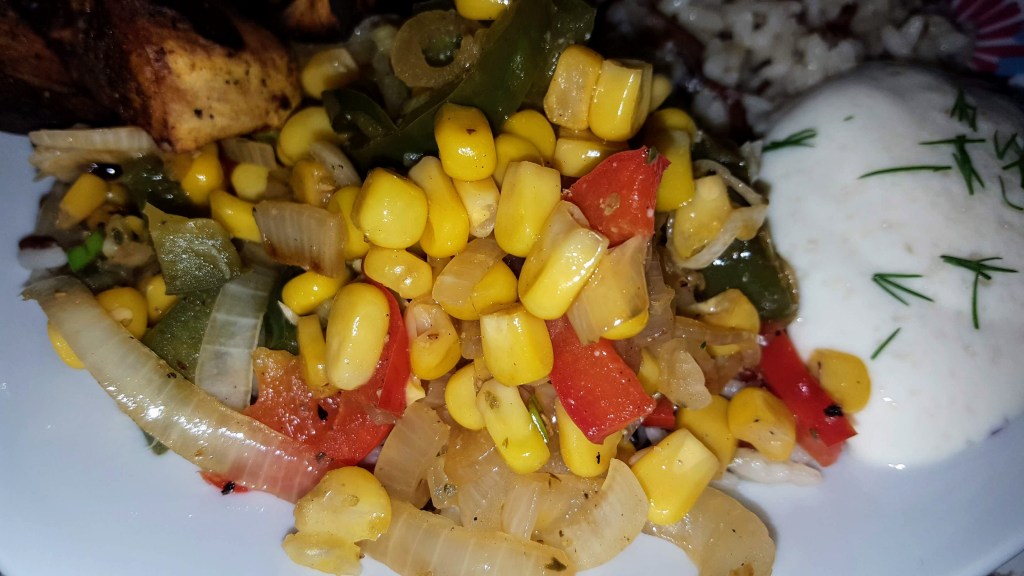 This is a cooked corn relish I made with onion, red & green bell pepper and garlic, tossed with lime before it was plated.
