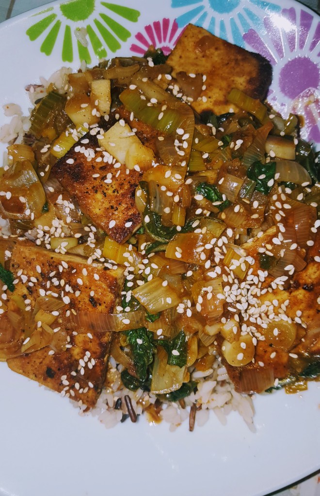 Serve on a bed of rice or noodles and sprinkle with sesame seeds (optional).
