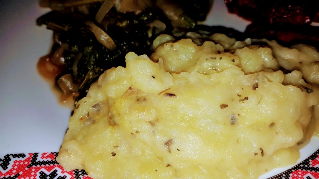 Since this meal wasn’t planned–at all–I had to go pantry hunting. I knew I had to do something with the turnips so immediately I thought mashed potatoes. But then I was like, but turnips aren’t that great on their own, and I decided to add two medium potatoes to the pot with the 3 turnips. Boil 20-30 minutes or until tender, then drain and reserve some of the water.