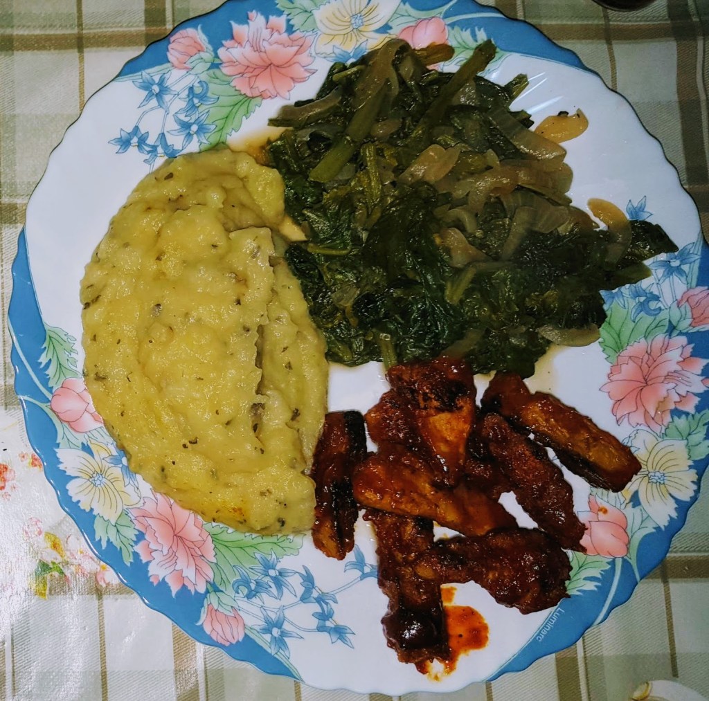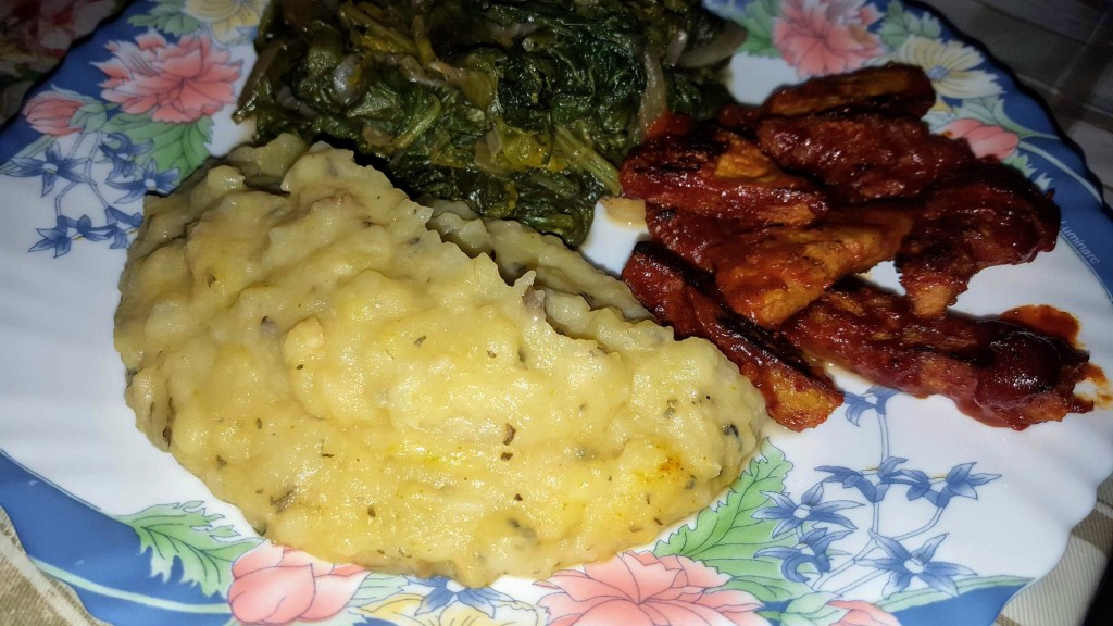 I know this is probably controversial because people LOVE to put milk and butter (vegan or otherwise) into their mashed potatoes but I like to use the water to minimize how much fat I’m adding to each dish. But I did use vegan butter and about 5 cloves of garlic and a tablespoon of dried basil for creamy, yummy, vegan vegetable mash.