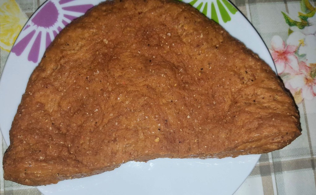 This is what the seitan steak looks like before it’s been cooked. This perfect half moon is the result of about 5 minutes (or more) of rigorous kneading and shaping. It hasn’t been cooked yet but it’s got good color and texture thanks to the spices and herbs like soy sauce, vegan Worcestershire, paprika and a bunch of other tasty stuff.