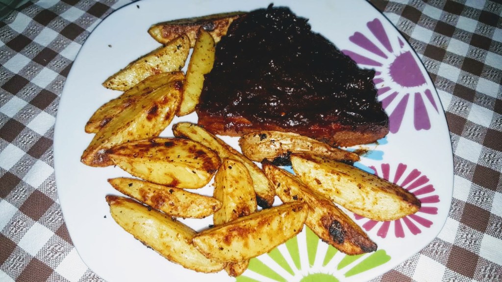 The steak came out pretty tasty. It was a little gummy at first but another 10 minutes in the oven and it was just about perfect. We don’t often do things like this, preferring a more plant based diet, but it was a fun change for a night or three.