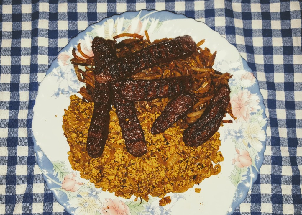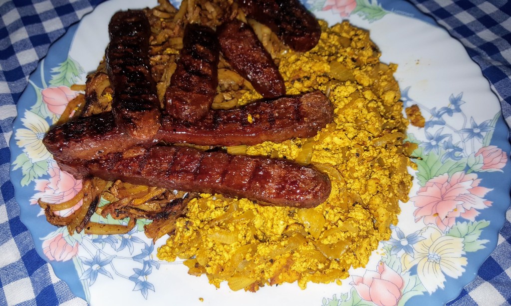 So the menu was tofu scramble, hash brown potatoes and barbecue ribs. I know what you’re thinking about the ribs, but this is the last piece of leftover seitan steak, re-purposed into “ribs” because, you know, breakfast ribs are a thing. Right?