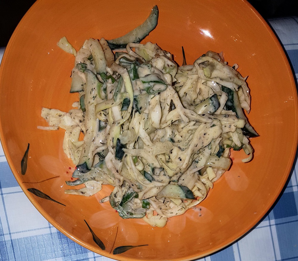 I sliced half a small cucumber on a bias and then halved them lengthwise, sliced a Pink Lady apple, the rest of the scallion from the garnish and about 80 grams of green cabbage. Tossed it with vegan yogurt, cumin, lemon juice and mint and that was it.