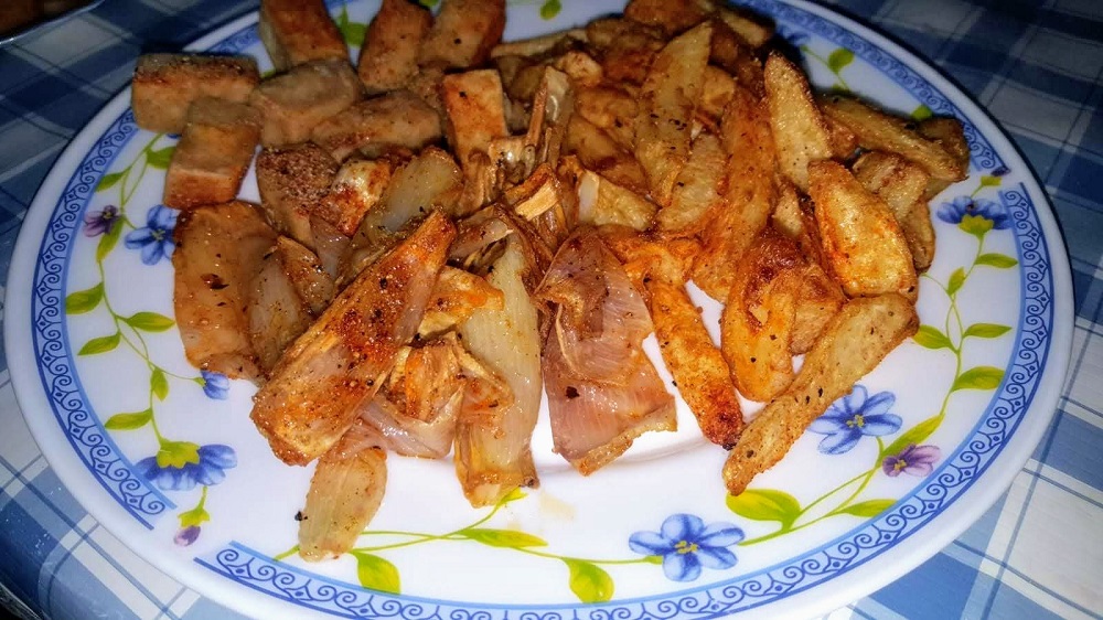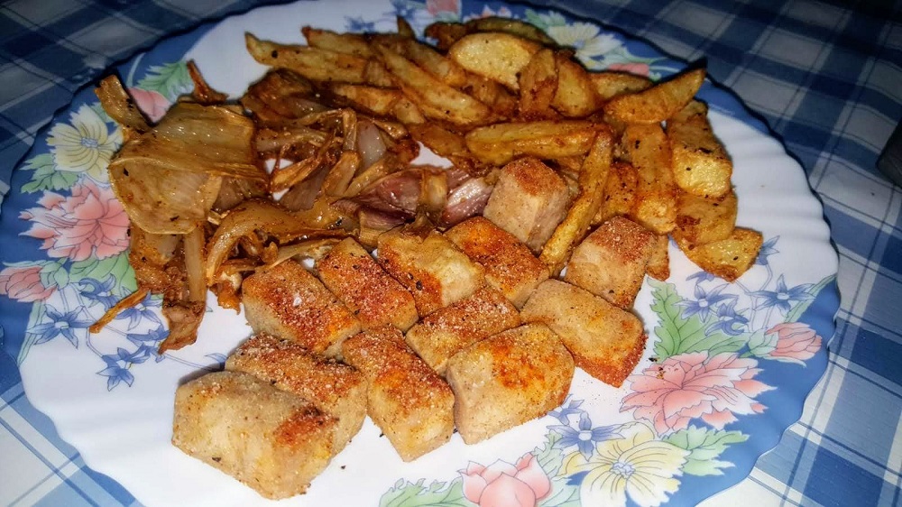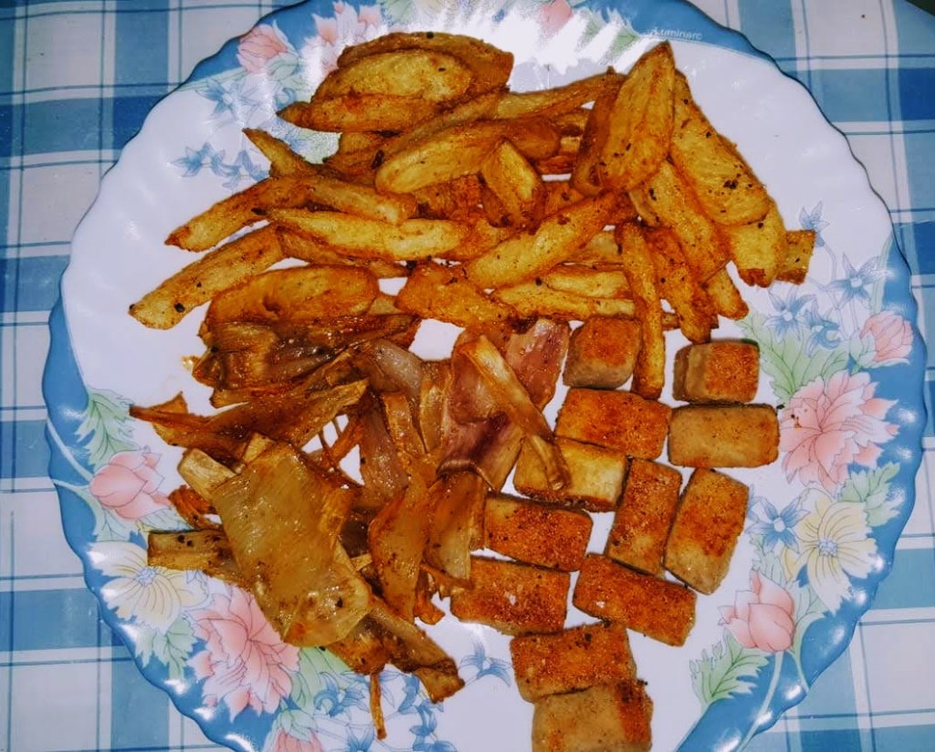 We kept the menu pretty basic: fried tofu nuggets, French fries and fried shallots.