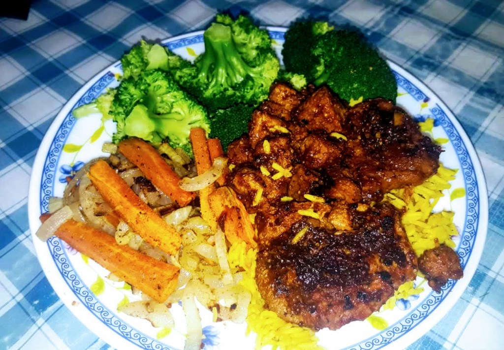 This beauty was made by my hubs. It’s barbecue tofu steaks, turmeric rice, steamed broccoli along with oven roasted carrot & onions. Probably the only thing that might be a turn off about this meal is that everything has to be prepped and prepared separately. The good news is that the rice takes no time at all, depending on what type and style of grain you choose. The carrots and onions get a quick seasoning and tossed in the oven until they’re cooked through. Steaming veggies is something most vegans–and adults–can do in their sleep so really, the biggest focus will be on getting the tofu steaks seasoned juuuust right.