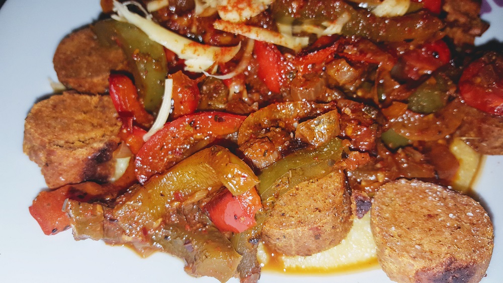 This dish was easy because I made the vegan sausage with seitan a few days before and I cooked the onions and peppers in the oven (an easy way to make your vegan dish oil-free) so it was a low-key, stress free meal that was super delicious. And if you’re feeling funky or adventurous, add some vegan cheese to the polenta for a creamier flavor.
