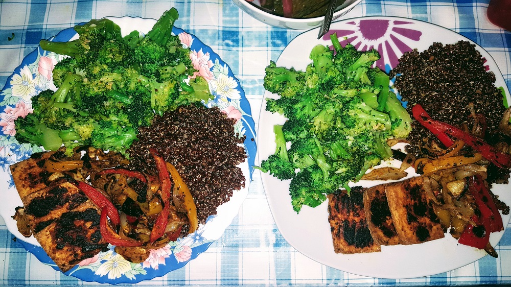 Next came the onions and bell peppers because I wanted to pop them into the oven to get a little char on’em. As you can see, I got a little more than I wanted but some of that was because of the spice rub I used. Same with the tofu.