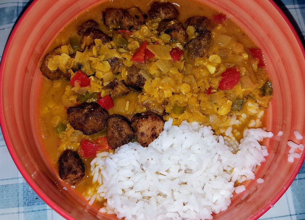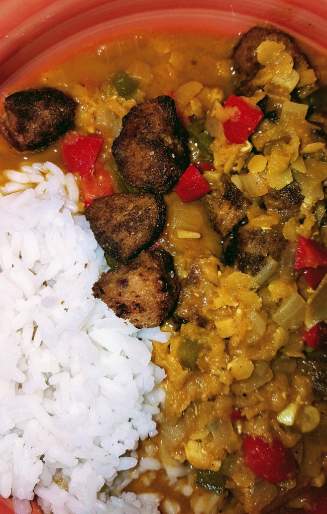 This time around I’ve decided to be a little bit naughty in my take on tarka dal, which is just another way of saying lentil stew. It is one of my favorite recipes and this time I used dry soy chunks because, well why not?
