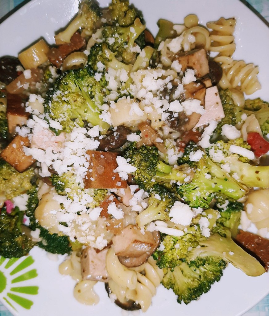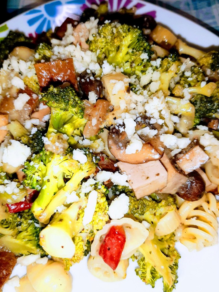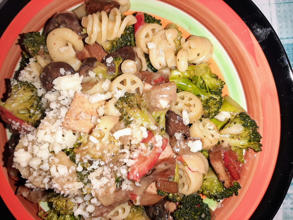 The good thing about a dish like this is that it is easy to make vegan and it’s a great dish to make sure you use up every veggie you doled out hard earned cash to buy. For this dish I started with my basics: onion, bell pepper and garlic. Broccoli, crimini mushrooms and smoked tofu rounded out the dish along with this strange mix & mash of pasta that I just couldn’t resist.