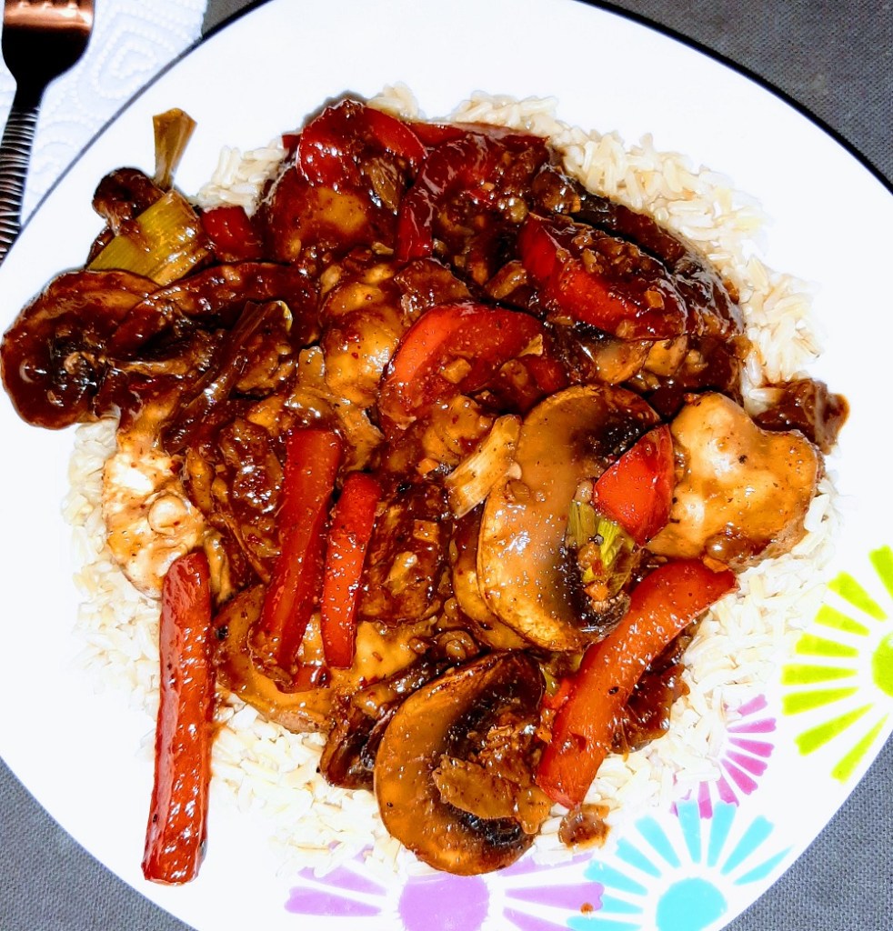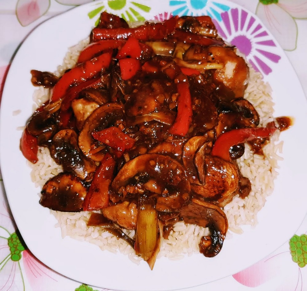 This dish consisted of leeks, mushrooms, bell peppers, garlic, cauliflower & ginger. You can add tofu or beans or whatever else you want but with the rice it was plenty satisfying and the sauce really brought it all together.