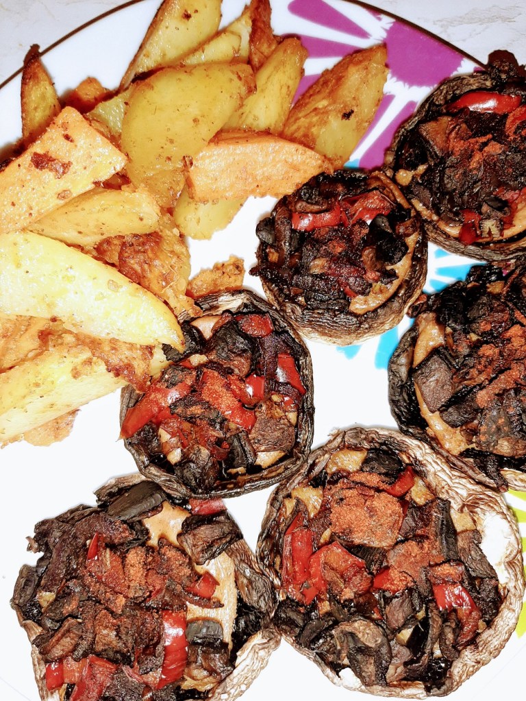 In the meantime, saute the mushroom stems, onion, bell pepper and garlic until it’s how you like it. But the beyond part of the equation is that there is a small disc of Beyond Sausage between the mushroom and the vegetables. He sliced 2 Beyond sausages and pressed them into the mushroom with this thumb, allowing them to cook with the remaining liquid from the mushrooms and the residual oil from the sauteed veggies.