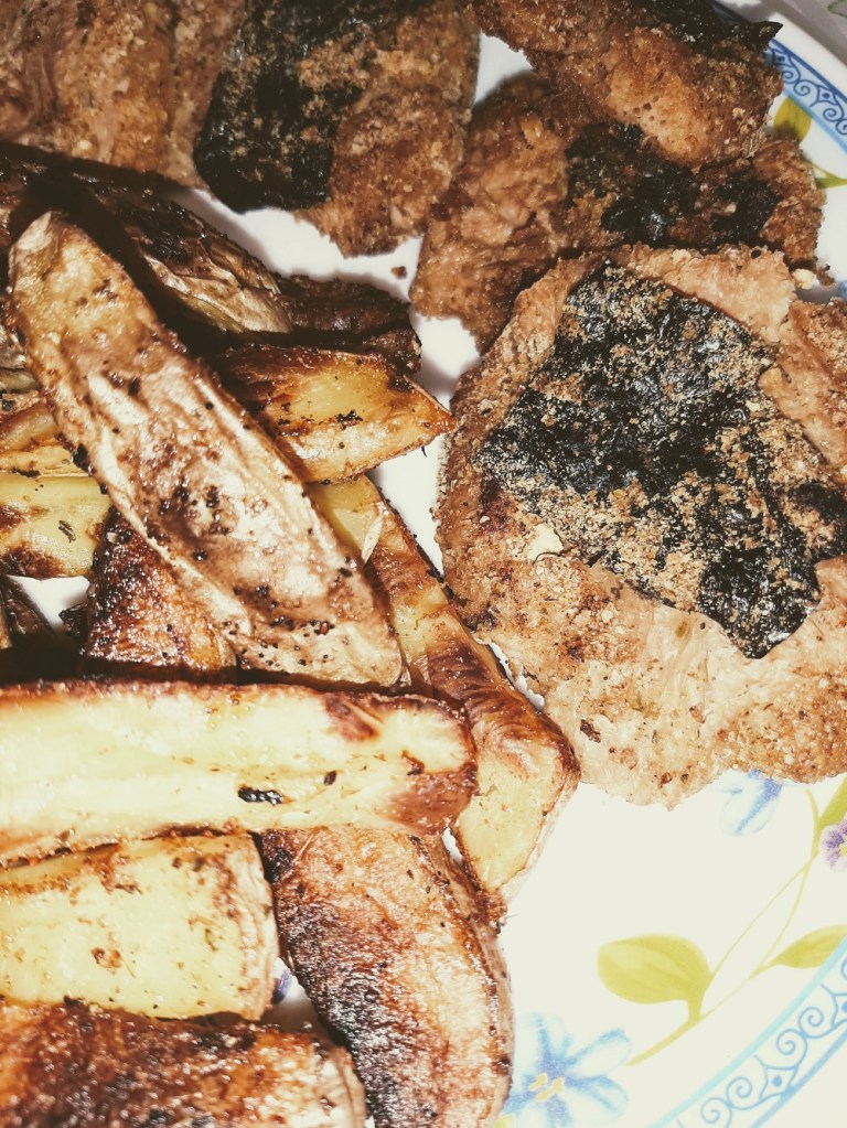 Two or three of the nori sheets ended up sticking to the pan, even through the light breading I used but it didn’t matter because they didn’t taste anything like fish. The taste was more like chicken fried steak without all the dryness, but definitely not fish. Even the nori was overshadowed by the seasoning, so the meal was good but NOT fish & chips.