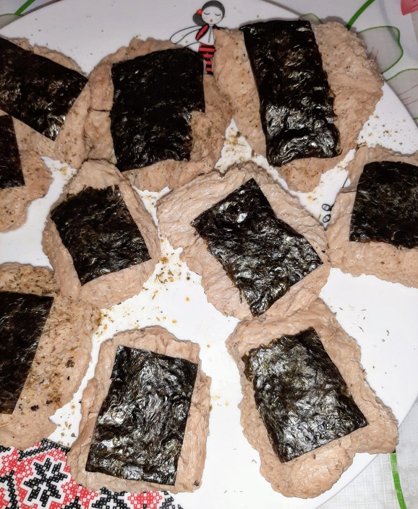 So like I was saying, prep work. First you’ll need nori sheets. These are just seaweed sheets but some can be “fish flavored” and therefore contain mollusks or shells so make sure you read those ingredients before tossing it into your shopping cart. The sheets have to be cut so they line up to whatever vegan protein you intend to use. I used the extra large soya pieces, hydrated and squeezed as dry as I could get them, because there was a run on tofu at the market last week…strange when all the other vegan products were available…
