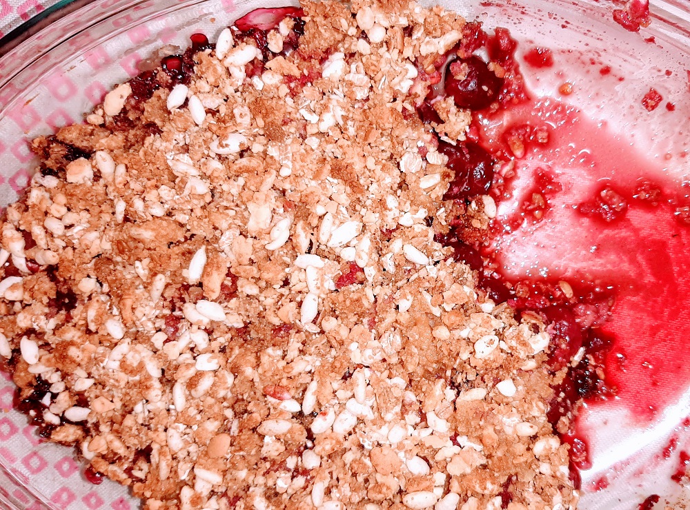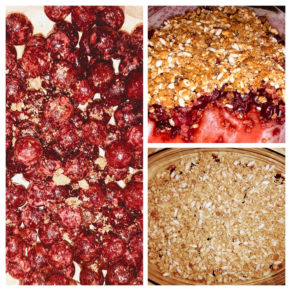 Place the cherries in the bottom of a pre-oiled baking dish and sprinkle the crumble mixture evenly on top. Bake 35-45 minutes until it is golden brown and crispy on top and bubbly underneath.