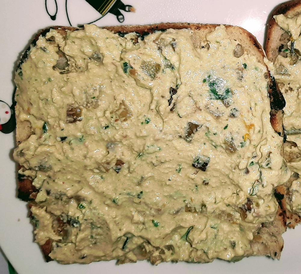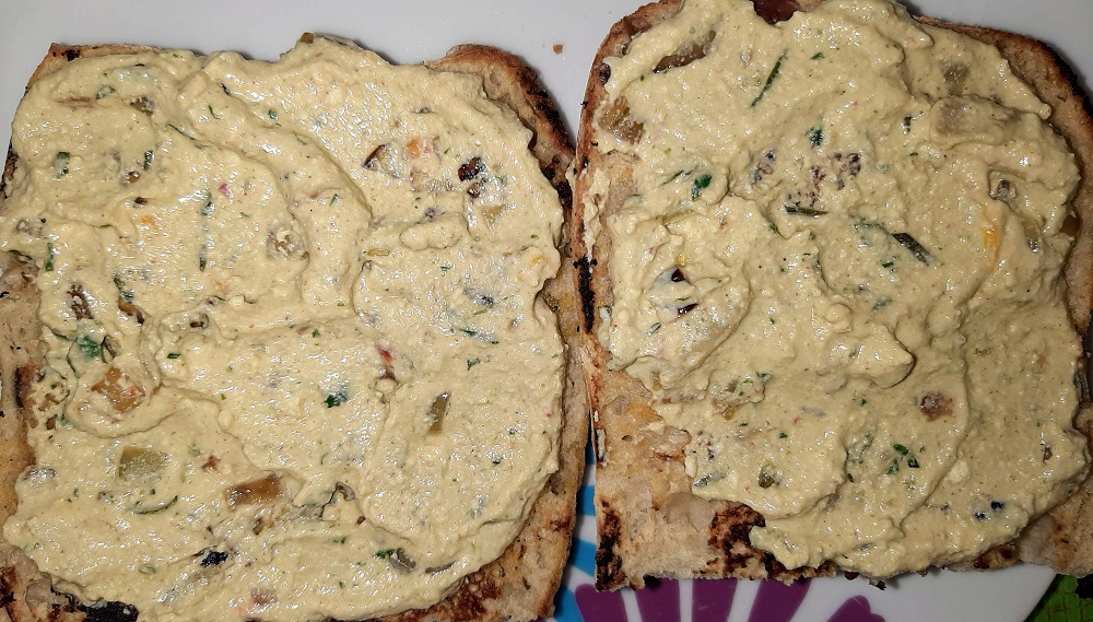 So I got a little creative. Tofu in salty brine water (I used Inedit brand) mixed with vegan cream cheese (Simply V brand). Give them, along with the garlic, lemon juice and chili pepper, a quick run in the food processor until smooth. You might have to add a bit of almond milk or whatever non-dairy milk you prefer. I used roasted unsweetened almond milk so it wouldn’t change the flavor too much.