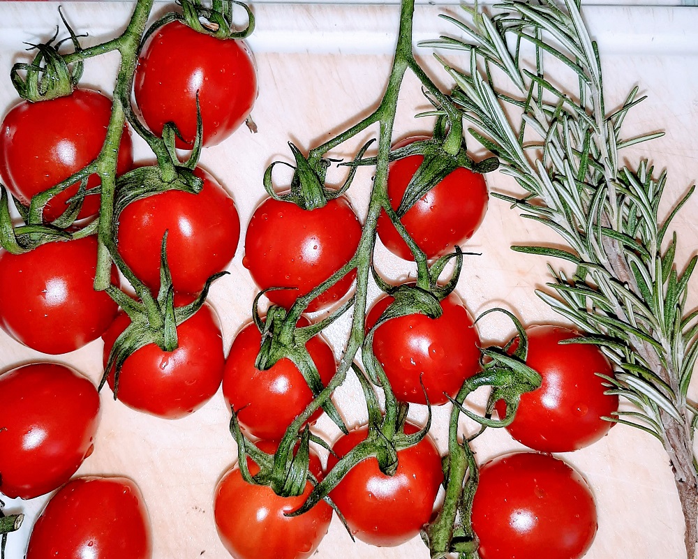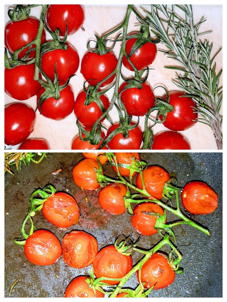 So the key to this recipe is the tomatoes. I used vine tomatoes because they looked really good and because I found some really incredible organic rosemary and…well look at it. This is the easy but time-consuming part. Add a bit of oil to the skillet (yes, I know about my oilless stance but I needed to compromise here so I did) and drop the tomatoes and rosemary in as they are. You’ll have to cook them for quite a while, until they start to brown/char a little and maybe even explode.