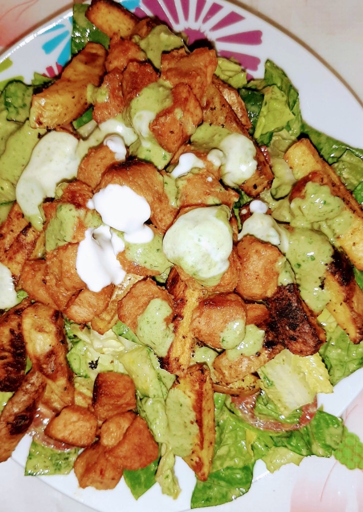 Make the salad and toss all the ingredients together in a big bowl, using a little more than half of the basil pesto cream as the salad dressing. Plate it and then add the spicy TVP and French Fries on top, drizzling the remaining pesto cream on top for color and taste.