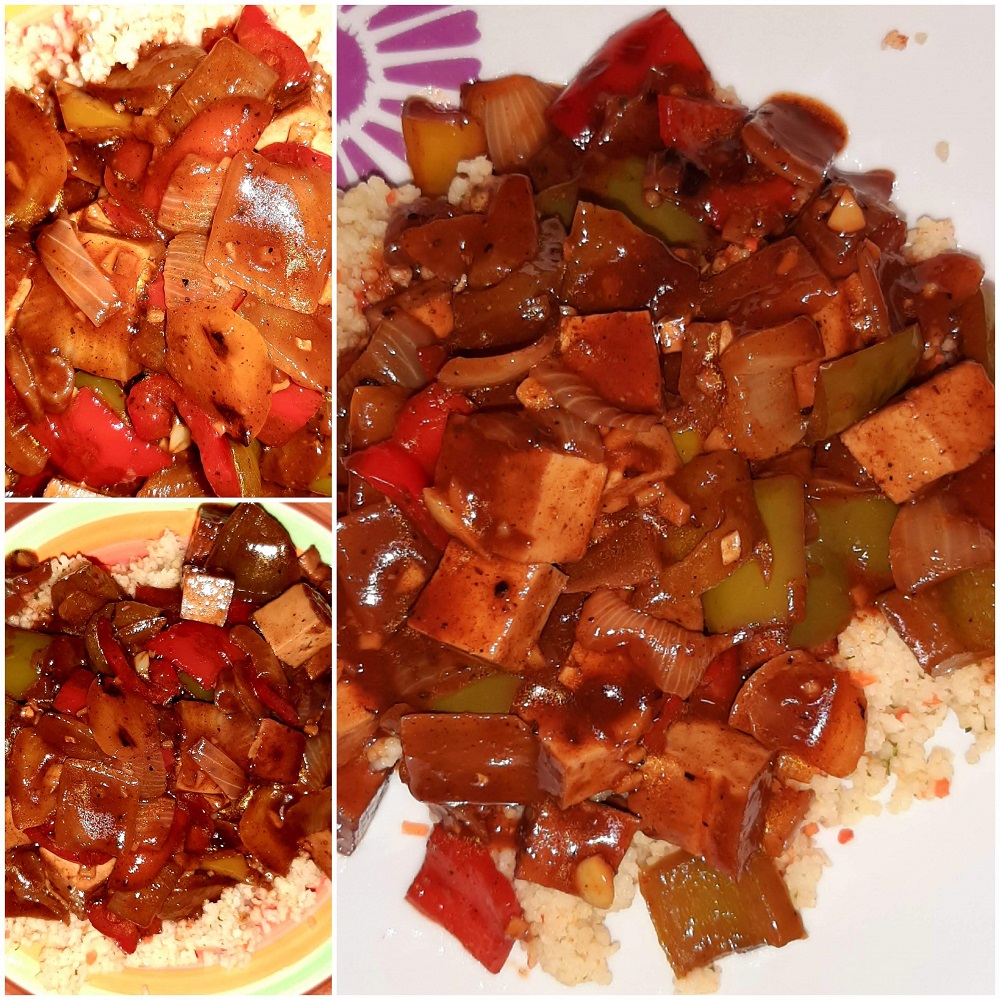 This particular bowl was SUPER easy, all you need is onion, bell pepper, garlic, smoked tofu and a grain of your choosing, the photo has bulgur in it. The sauce is a combination of tomato paste, soy sauce and Korean chili paste.