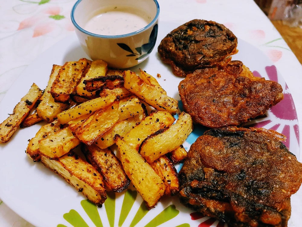 For this version of #vegan fish & chips though, my husband took his turn at bat. You’ll remember my own F&C recipe, which didn’t turn out so well visually but the taste was delicious…if you love nori which I kind of do not.