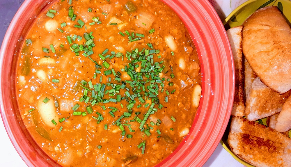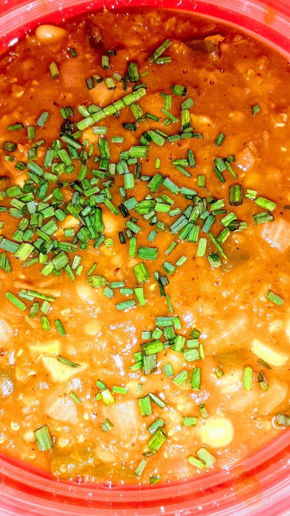 The ingredient list here is pretty simple: ginger, garlic, onion, navy beans, yellow lentils, green bell pepper, chives for garnish and no waste broth!