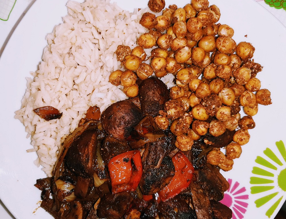 The fiber part of this lazy vegan meal includes crimini mushrooms, red bell pepper and onion. Simple, right? Sauté them up with or without oil until they reach the done-ness level you prefer. I like my mushrooms with a little bit of crisp on them so I cook them first before adding onions and peppers to the mix. The herbs and spices can be whatever you like, but if you’re going for simplicity I recommend, basil, oregano, garlic and thyme.