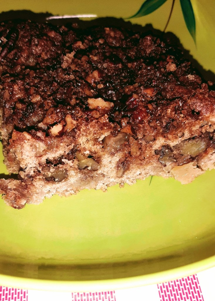 Cake batter layer –> Nut layer –> Cake layer –> Nut layer.