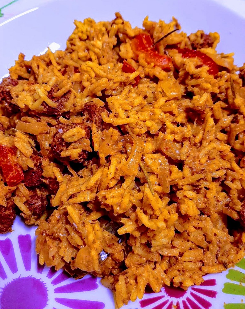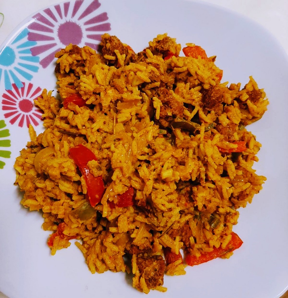If you’re not familiar with it, biryani is an Indian rice dish made with spices and protein, traditionally animal protein but we don’t do that here, so we’ve used TVP chunks, because they have plenty of protein and are the perfect meat substitute in this Indian rice dish.