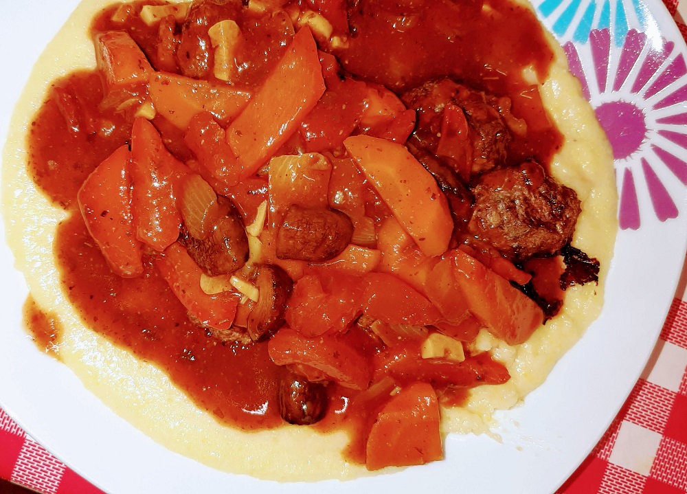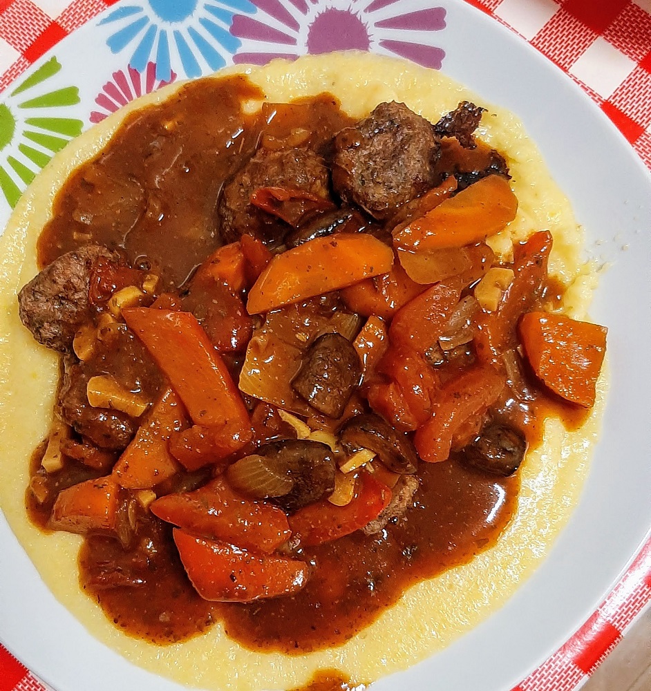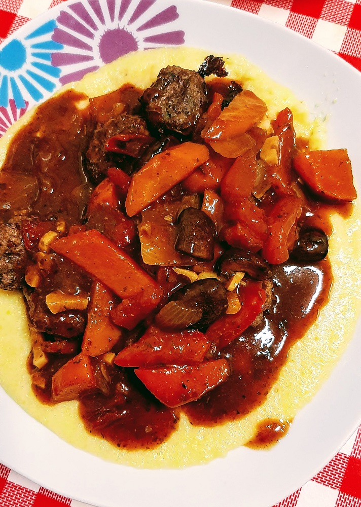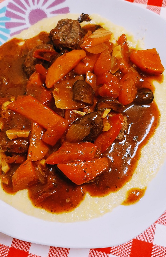 I was really in the mood for a hearty vegetable stew but my partner wanted me to make creamy polenta so I split the difference and added a lot less broth and served it on top of polenta. With the help of Beyond Burger vegan meatballs.