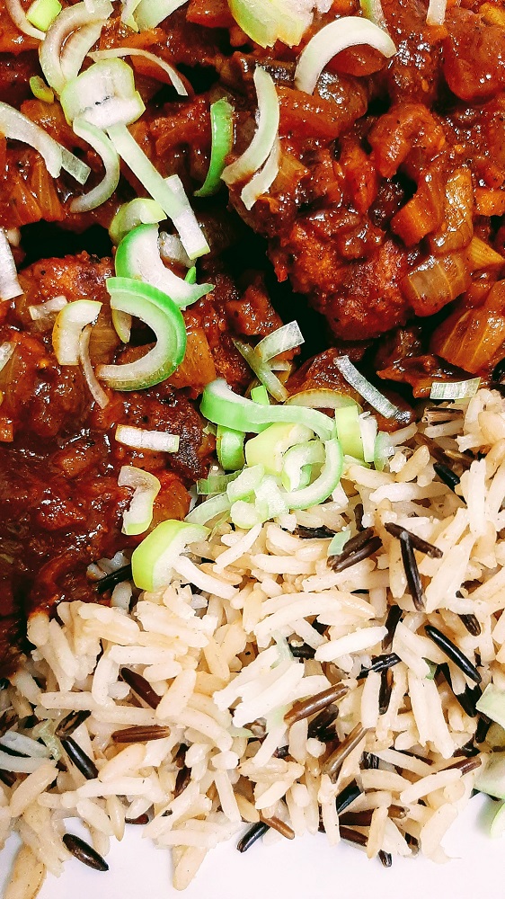 Oh, I also cooked up a few pieces of TVP and let them cook in the oven while I did all the prep work and tossed it with the veggies too so everything was good & saucy.