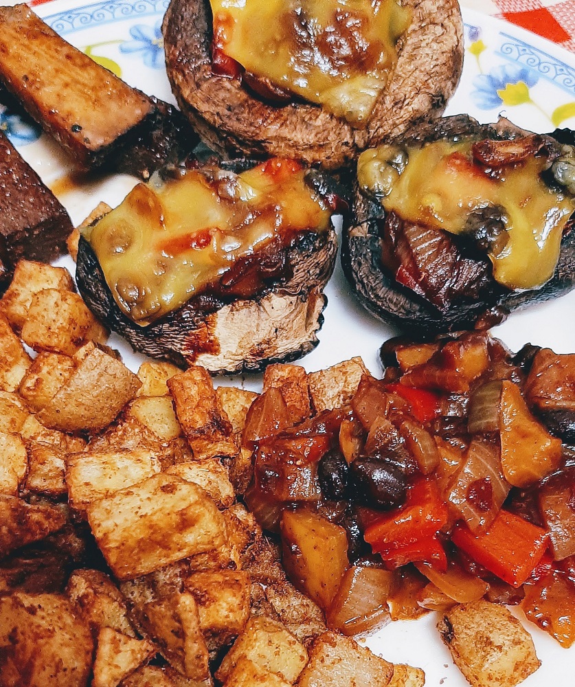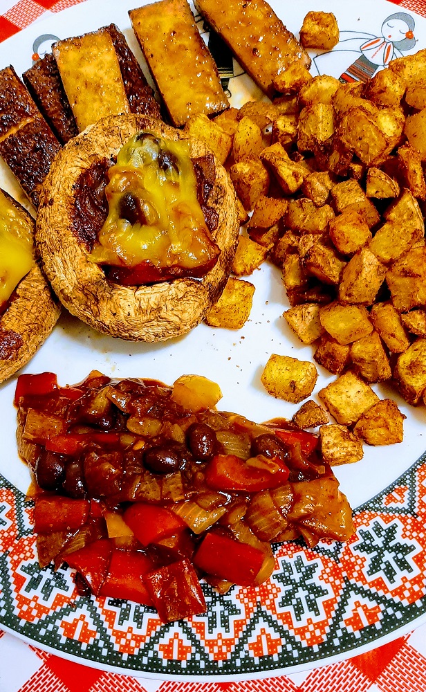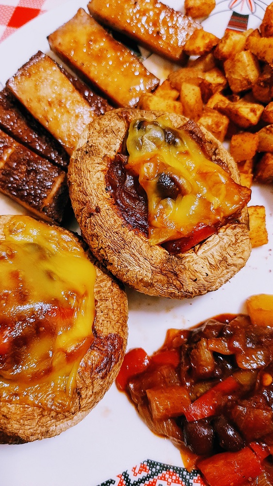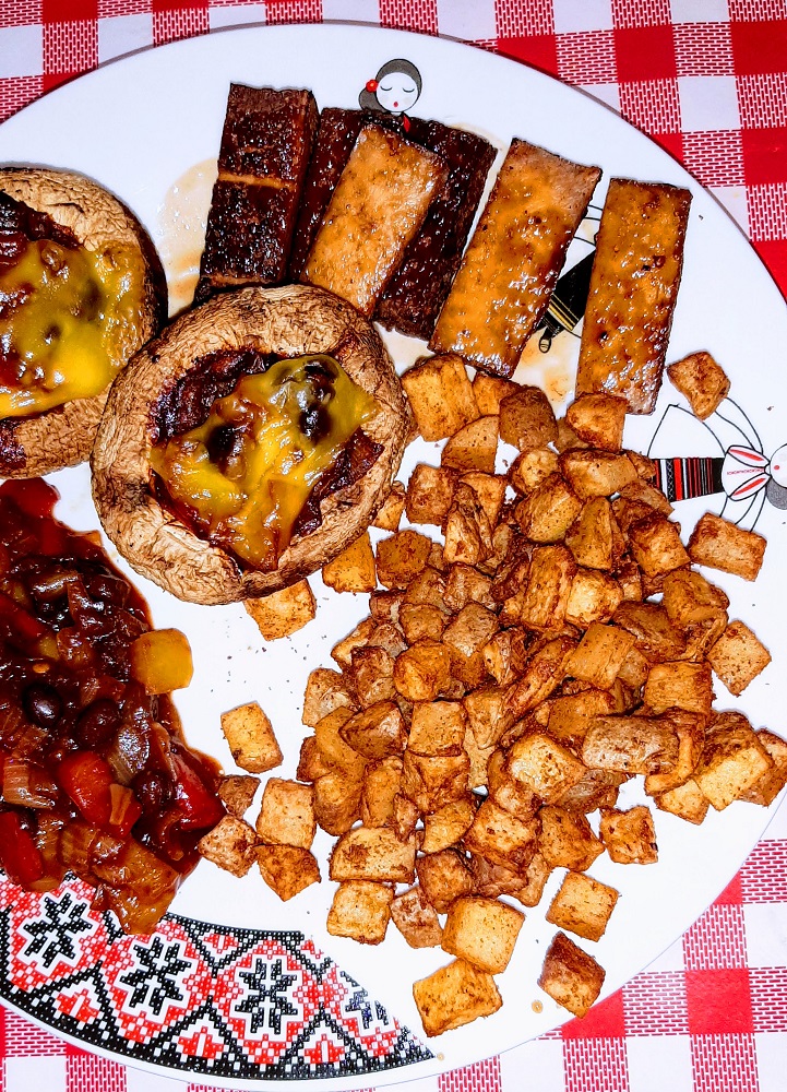 So I had to improvise with left over giant mushrooms and smoked tofu as the star of this vegan brunch dish.