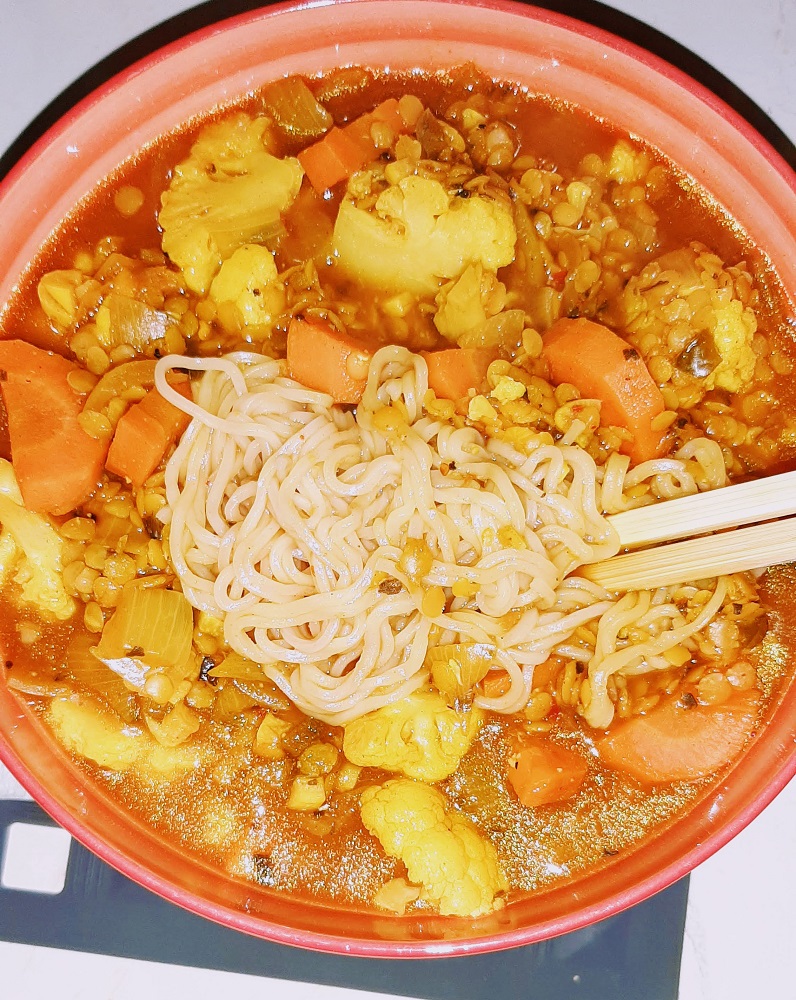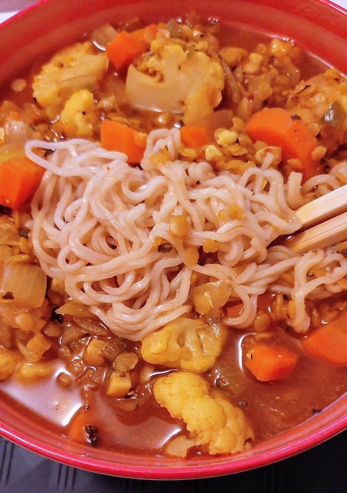 At least, that’s what I tell myself. But one day after a particularly grueling workout, I couldn’t decide if I wanted ramen soup (which I LOVE) or lentil soup. They couldn’t possibly go together, could they?
