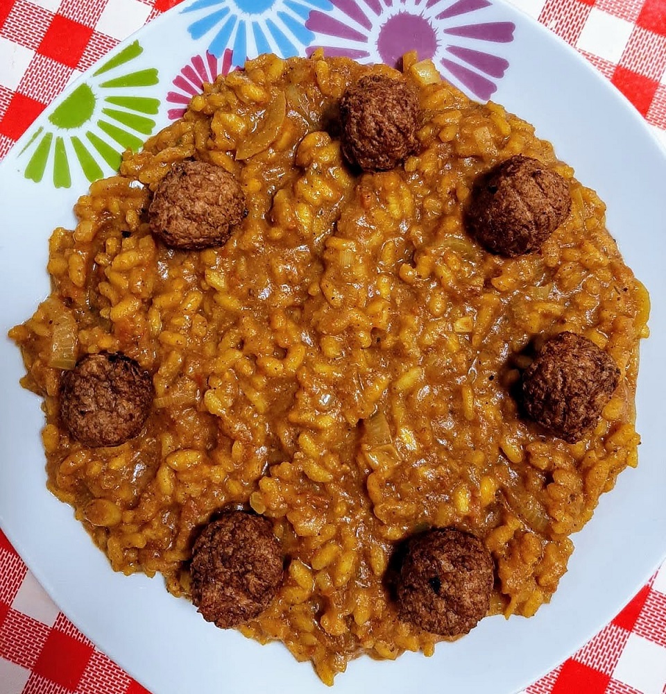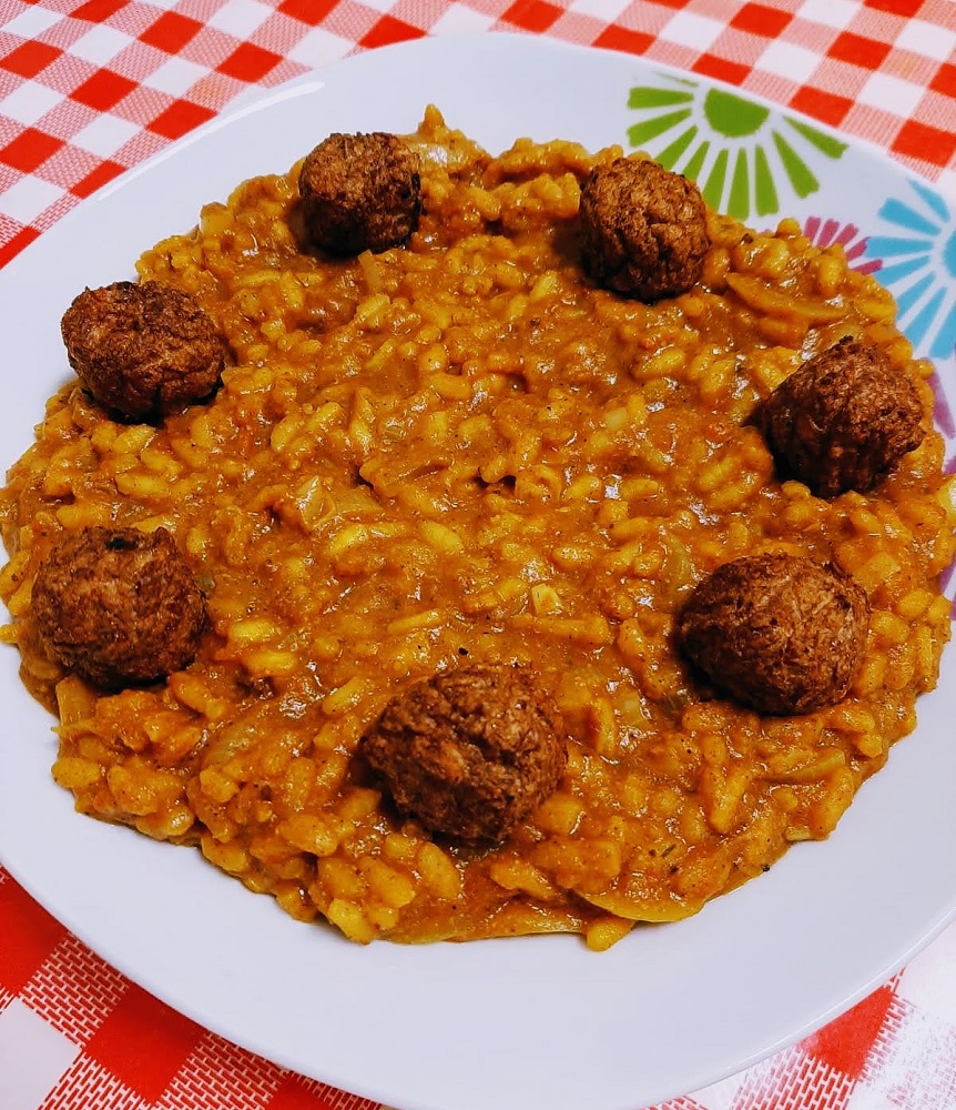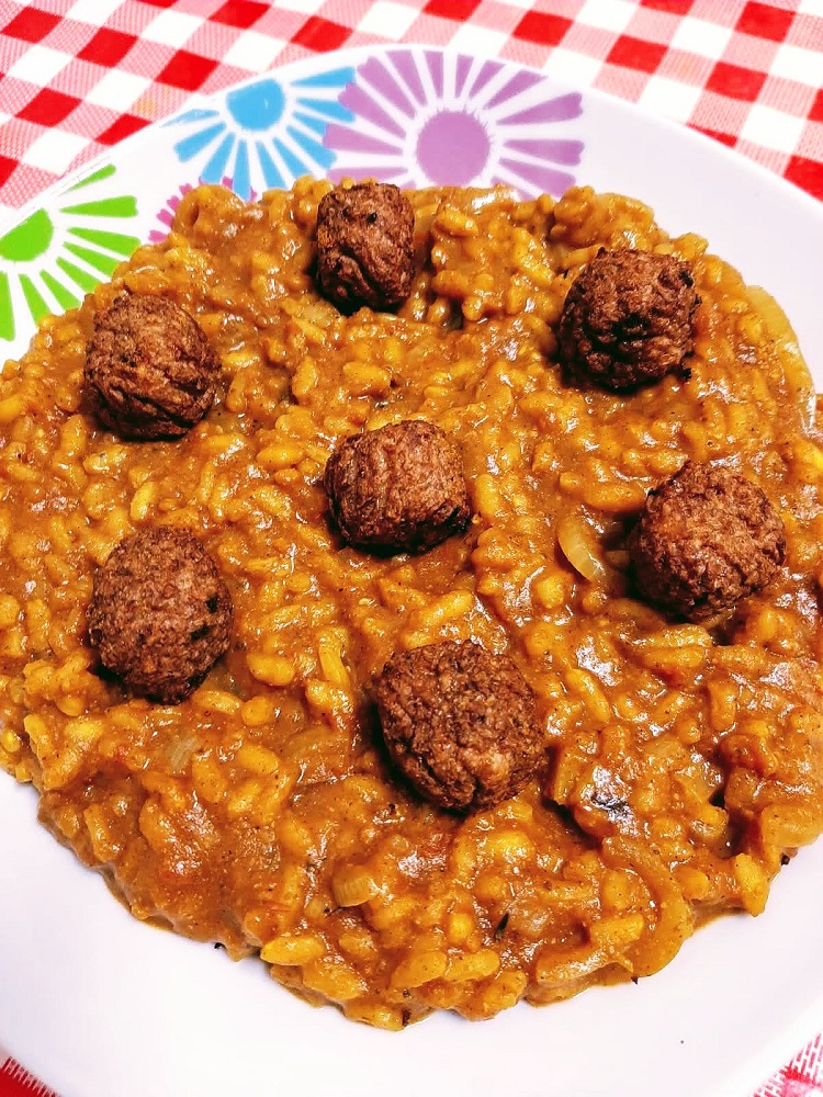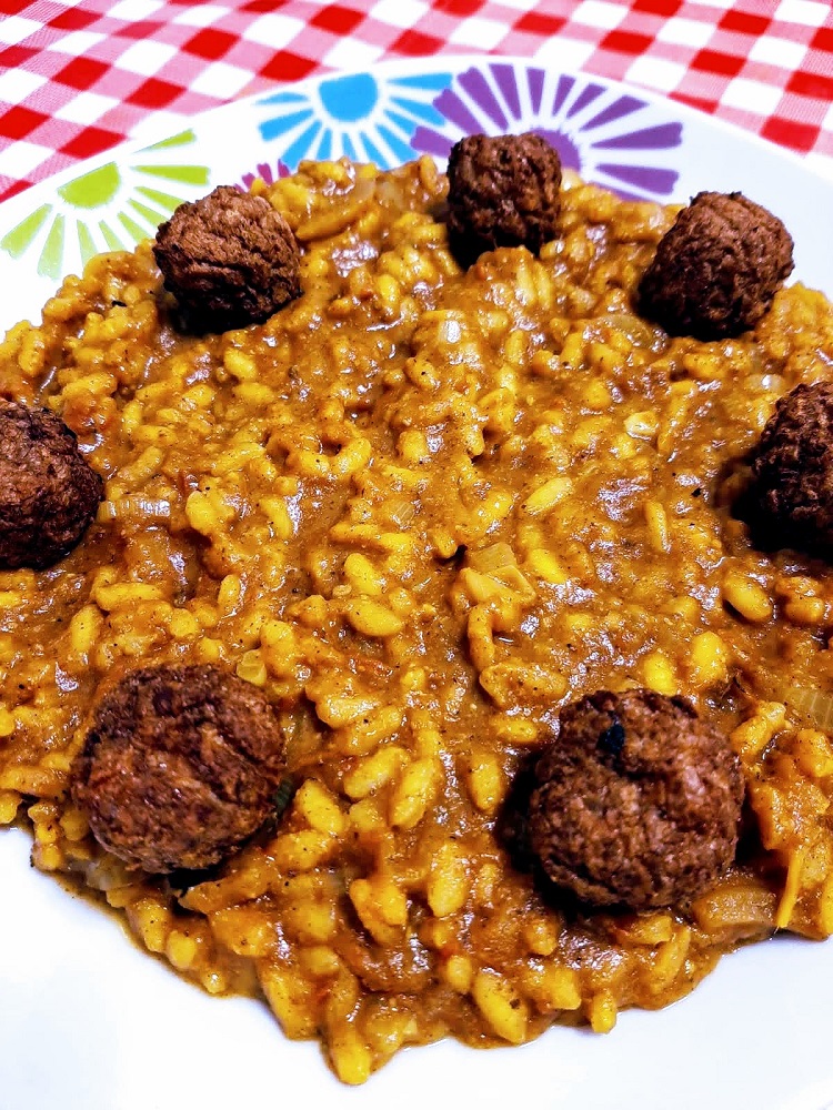There were curry meatball dishes for all diets and lifestyles, but I guess most people are purists when it comes to risotto, where I am not. So this is what happens when you ask for curry, vegan meatballs and risotto for dinner.