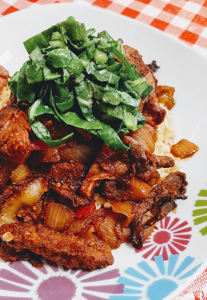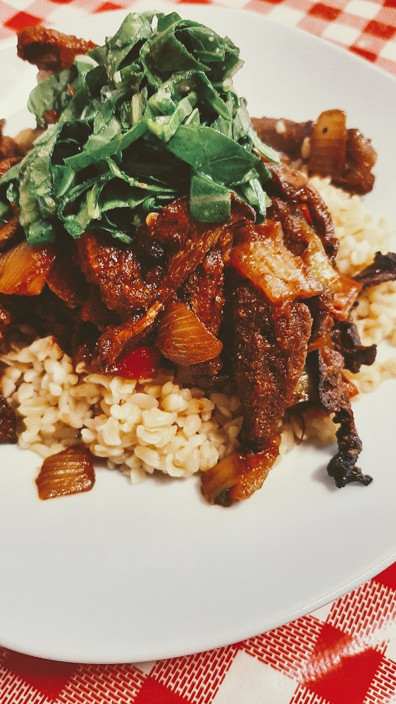 Chop onions and bell peppers, anyway you like, and add to a hot skillet/pan along with the vegan protein. Cook until it’s sizzling and starting to brown on the edges, or you know, cook it however you prefer the texture of your vegetables and proteins. The choice is yours. When it’s just about ready, mix together harissa paste, barbecue sauce, tomato paste, cayenne pepper, and Crazy Bastard Chipotle hot sauce until blended. Dump in the skillet. You’ll need to add water or broth to loosen it up a bit, and don’t forget we still need to toss the mushrooms when the oven timer beeps, so don’t be afraid to make this dish SAUCY!