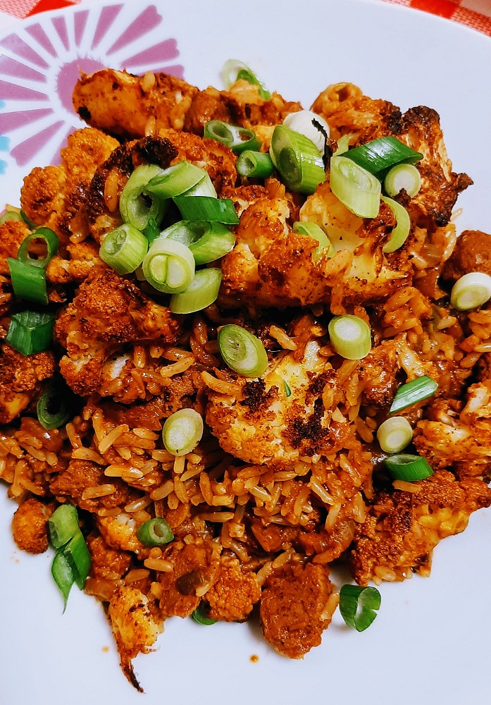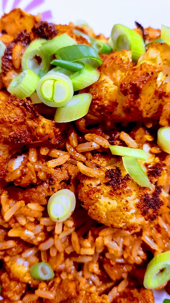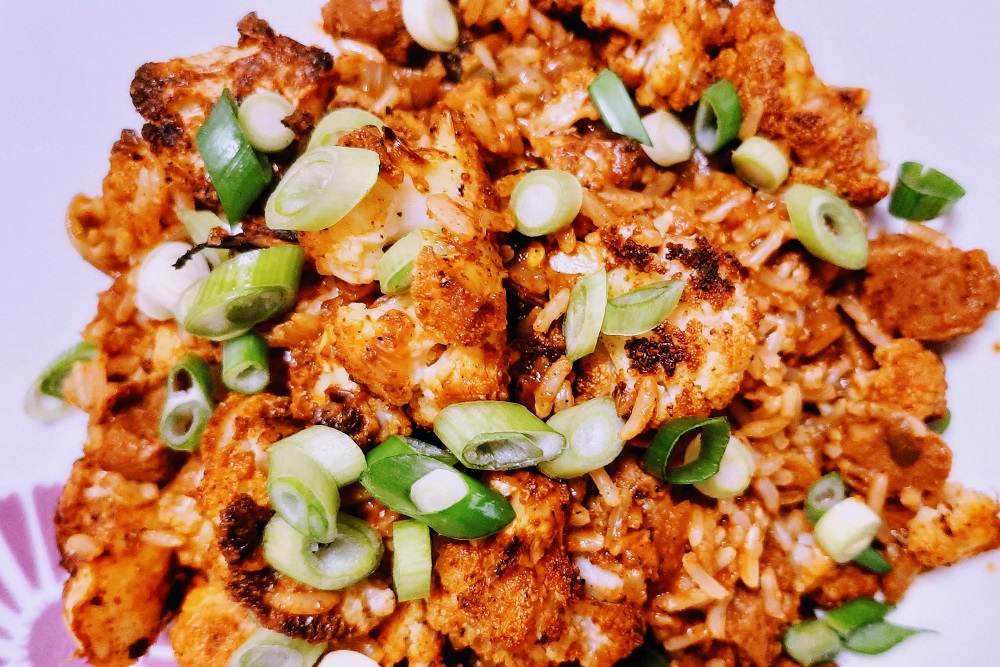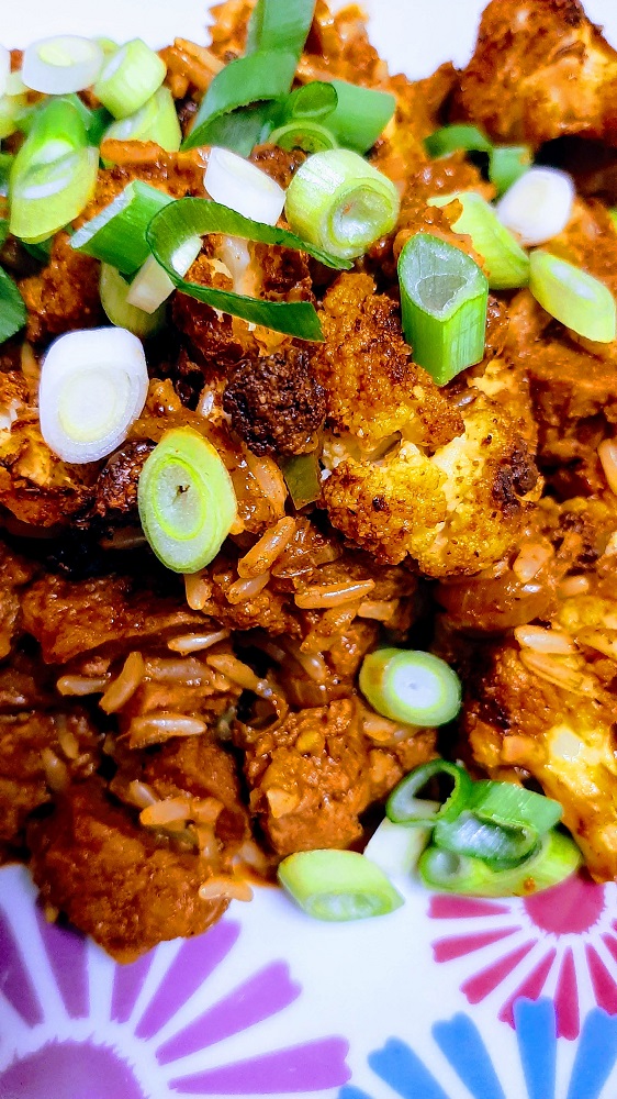 When it comes to cooking cauliflower, I prefer to cook it separately and usually in the oven because it gets those nice crispy edges in the oven or the air fryer. For this particular recipe, I used a combination of Indian spices and peanut oil, tossed with the cauliflower and then laid out on a baking sheet. It can take anywhere from 20 to 35 minutes in the oven, or about 15 to 20 in the air fryer, but you should use your eyes and your mouth to decide when your cauliflower is perfectly ready.
