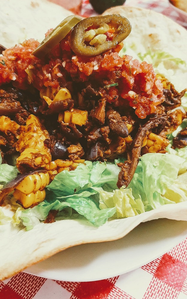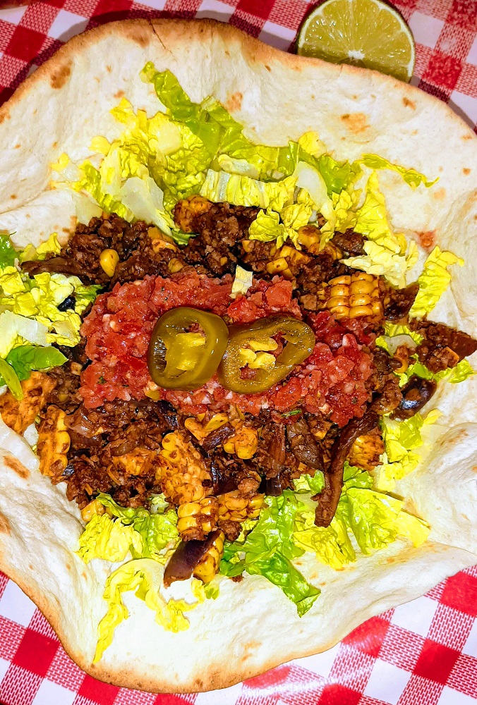 I made corn, mushroom and mince taco salad inside a tortilla salad bowl. Let’s start there.