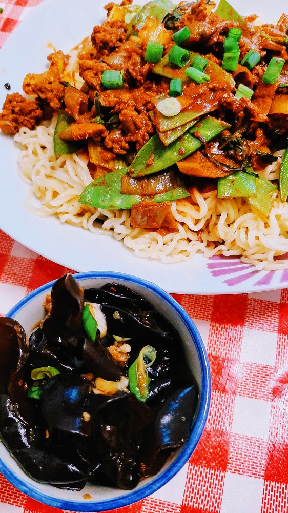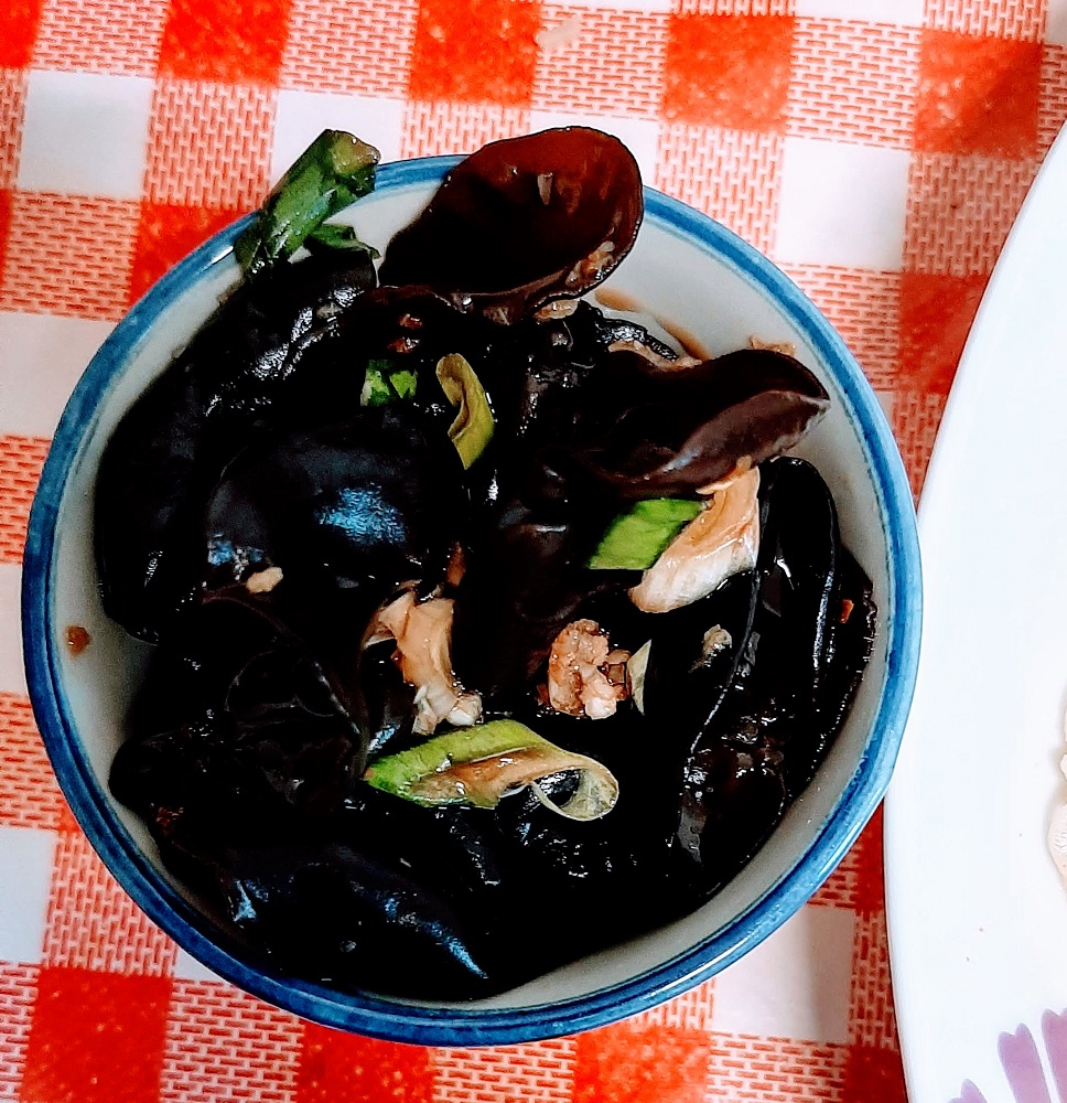 For the mushrooms: Rinse mushrooms and boil them for 3 minutes. Drain and let sit or run through a salad spinner to dry. In a bowl combine: Chinese black vinegar, pressed garlic, chili flakes, soy sauce, scallions & half hot chili diced finely. Toss with mushrooms and refrigerate for 10 to 15 minutes. Done!