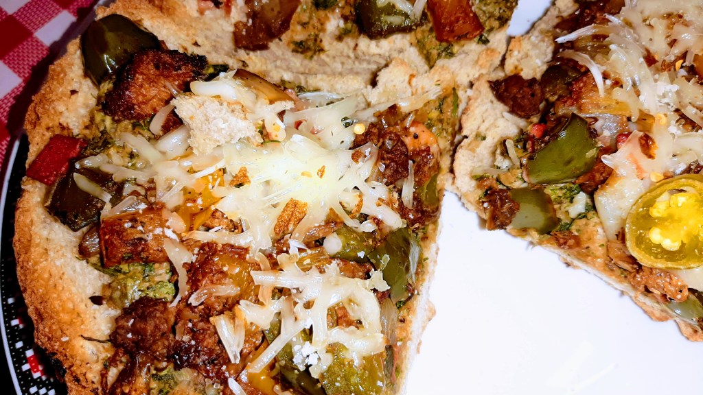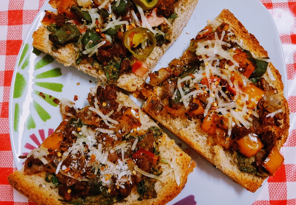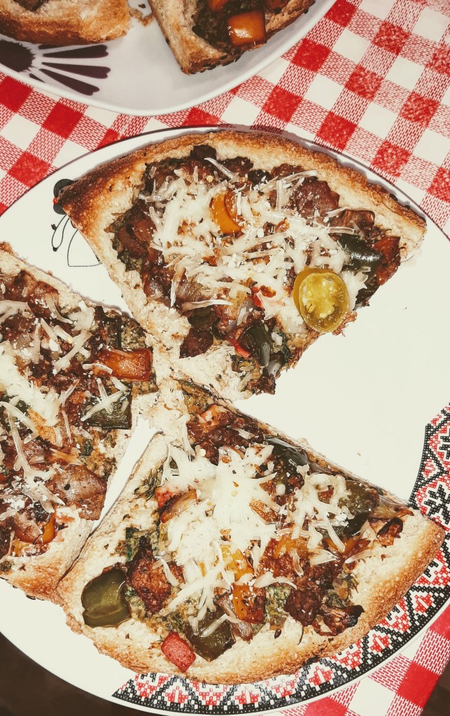 This particular vegan recipe included: vegan mince, homemade pesto, bell peppers, onions, shallots & vegan mozzarella shreds.