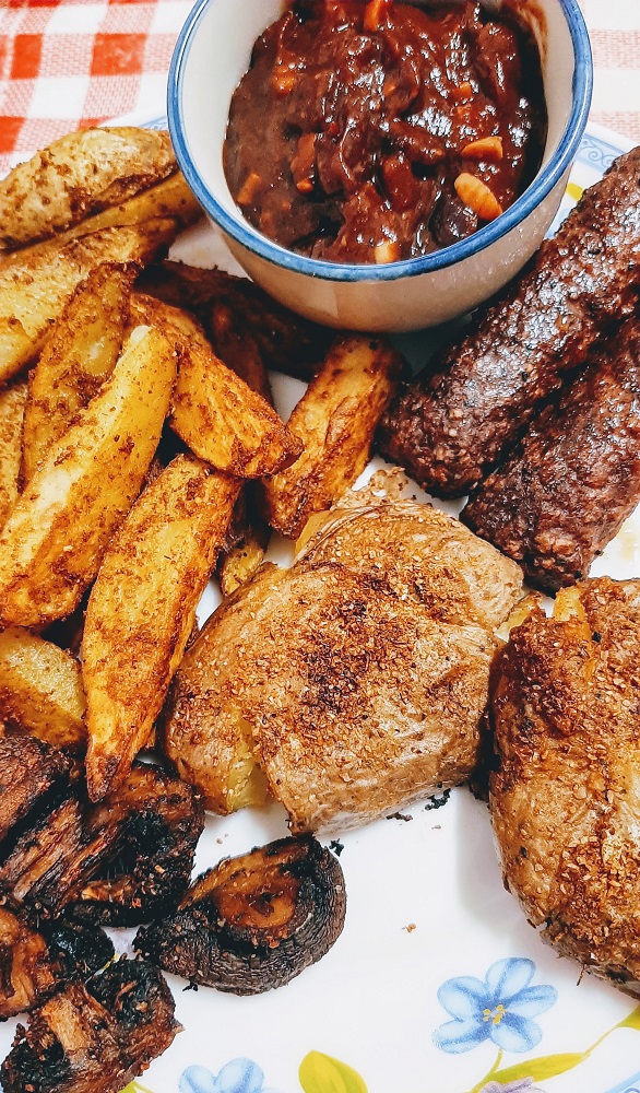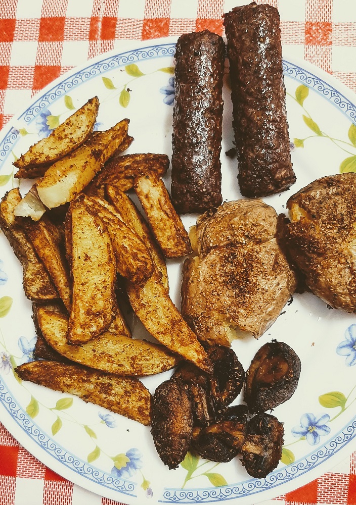 The ingredient list for this vegan pub meal is pretty simple: vegan mici, potatoes (lots of potatoes) and crimini mushrooms. I didn’t add onions or garlic the way I used to, okay well I did but only for the dipping sauce because you can’t have potatoes without a proper dipping sauce.