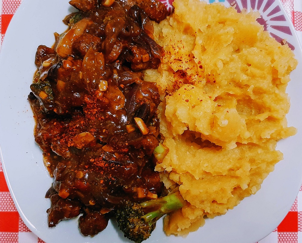 Mongolian Vegan Beef…but with mashed potatoes instead of rice or noodles.
