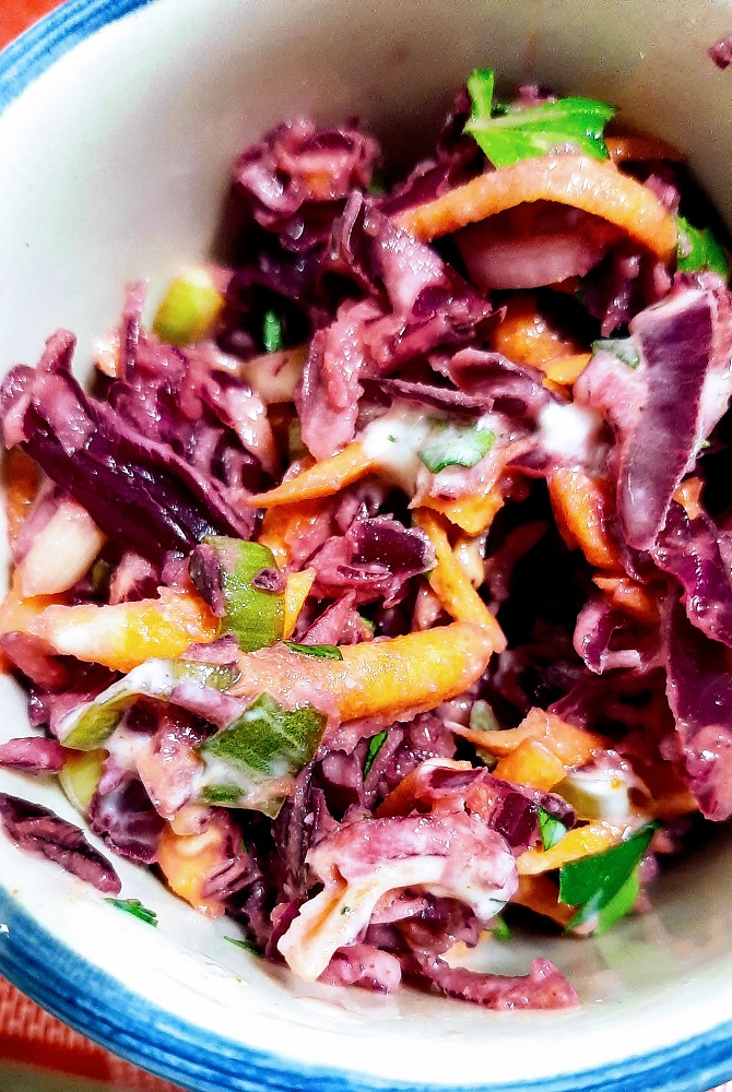 Then, there’s the pickled cabbage, which you don’t have to pickle. You can make a light dressing with vinegar and call it a day. I used red cabbage, grated carrots, fresh parsley, scallions and 1 clove of garlic, pressed. For a quick pickling, I used lemon juice, sugar, black pepper and salt. Stir until sugar dissolves. Toss it all together and set aside. If you want less crunchy veggies, salt them first and leave them for 10 minutes, and then add the lemon juice sugar mixture.